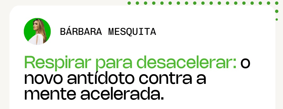 A Bárbara convida à pausa em meio ao caos moderno e mostra, com base científica, como a respiração consciente pode ser uma aliada poderosa da saúde mental. Em seu texto, ela explica o papel do sistema parassimpático e ensina técnicas simples para restaurar o equilíbrio entre corpo e mente, um lembrete de que o bem-estar começa no gesto mais básico e vital: respirar.